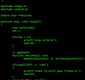 [LoB RedHat 6.2] LEVEL 5: orc -> wolfman LEVEL 5: egghunter + bufferhunter 환경변수, buffer를 이용한 공격이 막혔다. 하지만 아직 argv[2]는 유효하다. bash2 실행 후 복사본 만들고 분석해보자. LEVEL 4와 payload는 같다. strcpy 호출 직후의 위치를 파악하고 그곳에 breakpoint를 건 뒤 Stack을 살펴보자 저번과 비슷하다. 적당히 0xbffffc44를 ret 주소에 덮기로 하자. argv[1]: buffer+sfp를 A 44개로 덮고, ret은 위에서 봐둔 argv[2]의 NOP sled 중간 주소argv[2]: NOP 40개 + 쉘코드 로 구성한 payload로 쉘을 얻었다. 더보기 [backdoor] magic (10p) 이번 문제는 base64 인코딩 된 문자열을 해독하는 문제이다. (10점이라 얕봤다) Python으로 이렇게 하면 쉽게 디코딩이 가능하다. 실행해보니, 다시 암호화된 문자열이 나온다. Caesar Cipher인 듯 하니 brute force 코드를 짜서 확인해보자. 이런 식으로 짜면 된다. 알파벳 범위 안에서 해야 하므로, 'Z'를 넘어선 ASCII 코드 값의 경우 26을 빼고 문자로 변환한다. 실행하면 이렇게 나오는데, 정상적인 단어가 나오는 문장이 평문이다. 위에서 얻은 패스워드를 SHA256 해시 값으로 만들어야 한다. 아래와 같이 코드를 추가해주면 된다. 이러면 해시값이 나오는데 인증하면 ??? 안된다. 대문자인 패스워드를 대상으로 해시 돌렸는데, 소문자로 해봐야겠다. 뒤에 .lower()만 붙이.. 더보기 이전 1 ··· 622 623 624 625 626 627 628 ··· 661 다음